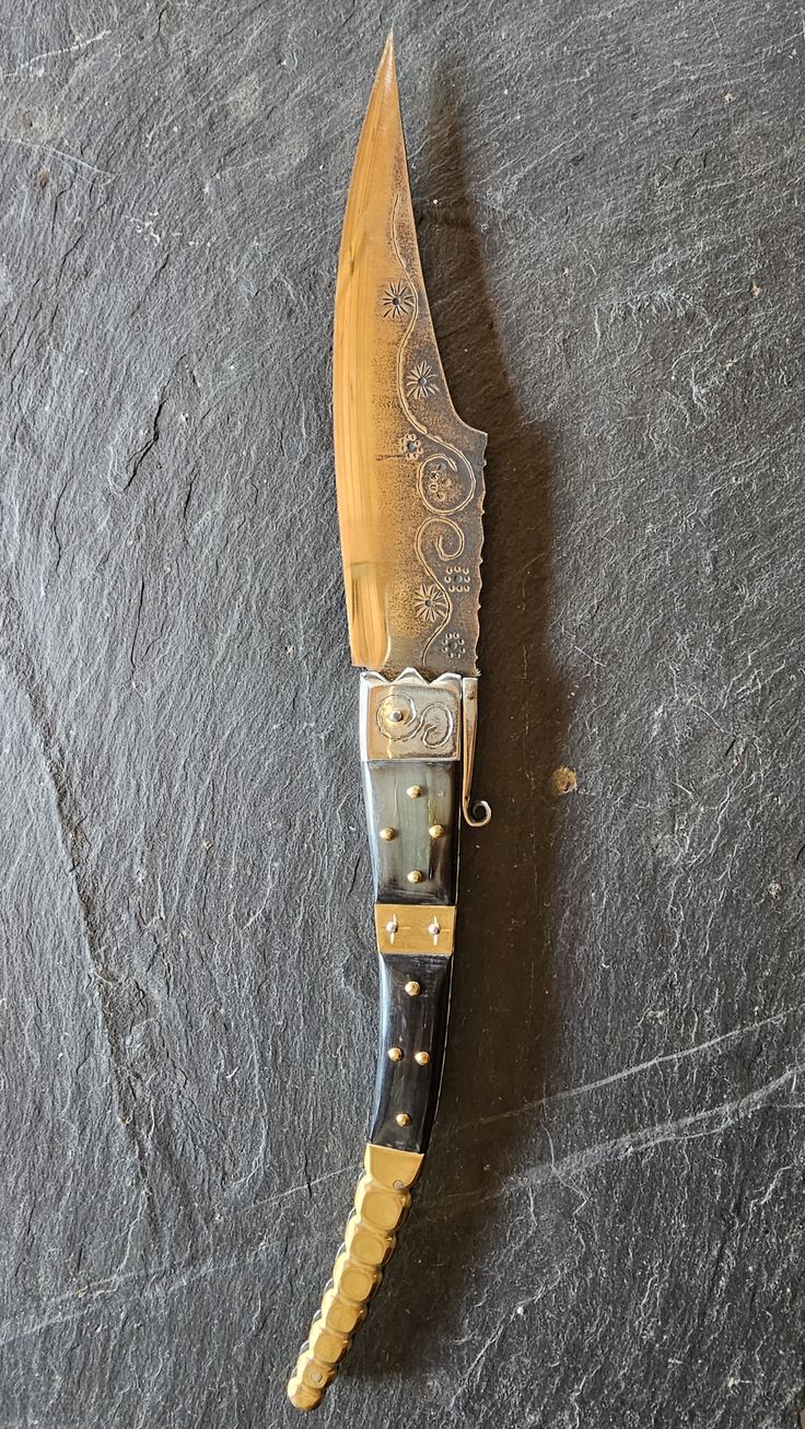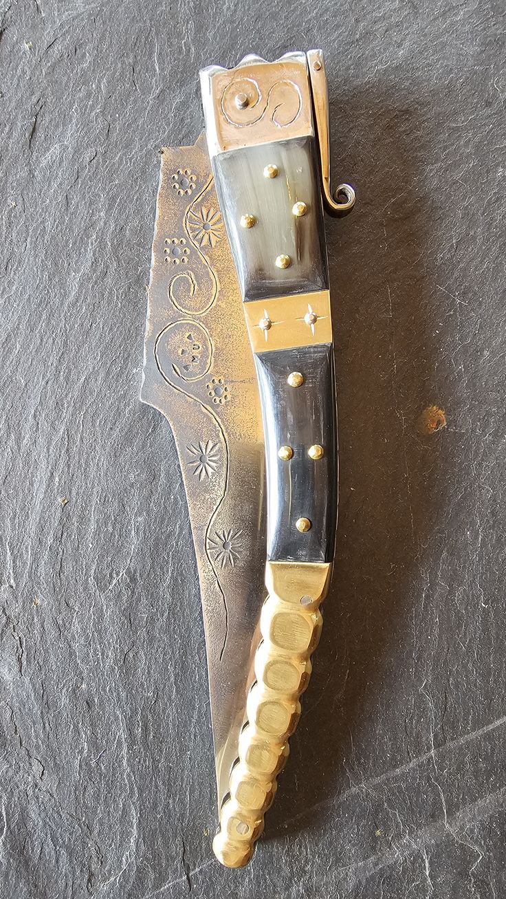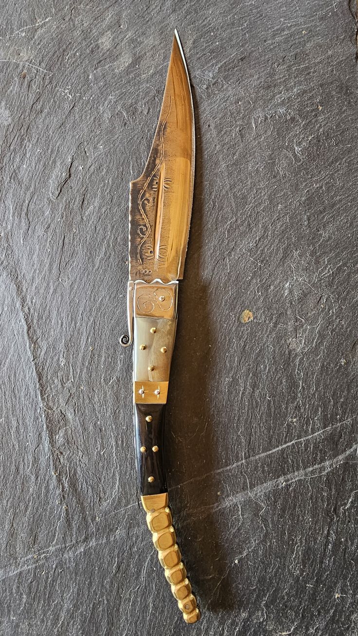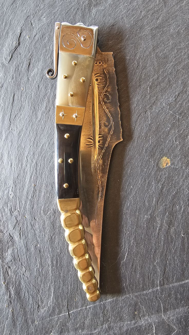 Hoja de Acero inoxidable mova, cachas en cuerno de Toro, Búfalo y Latón, forros, virola, rebajo y remaches, en acero inoxidable 304 y Latón.