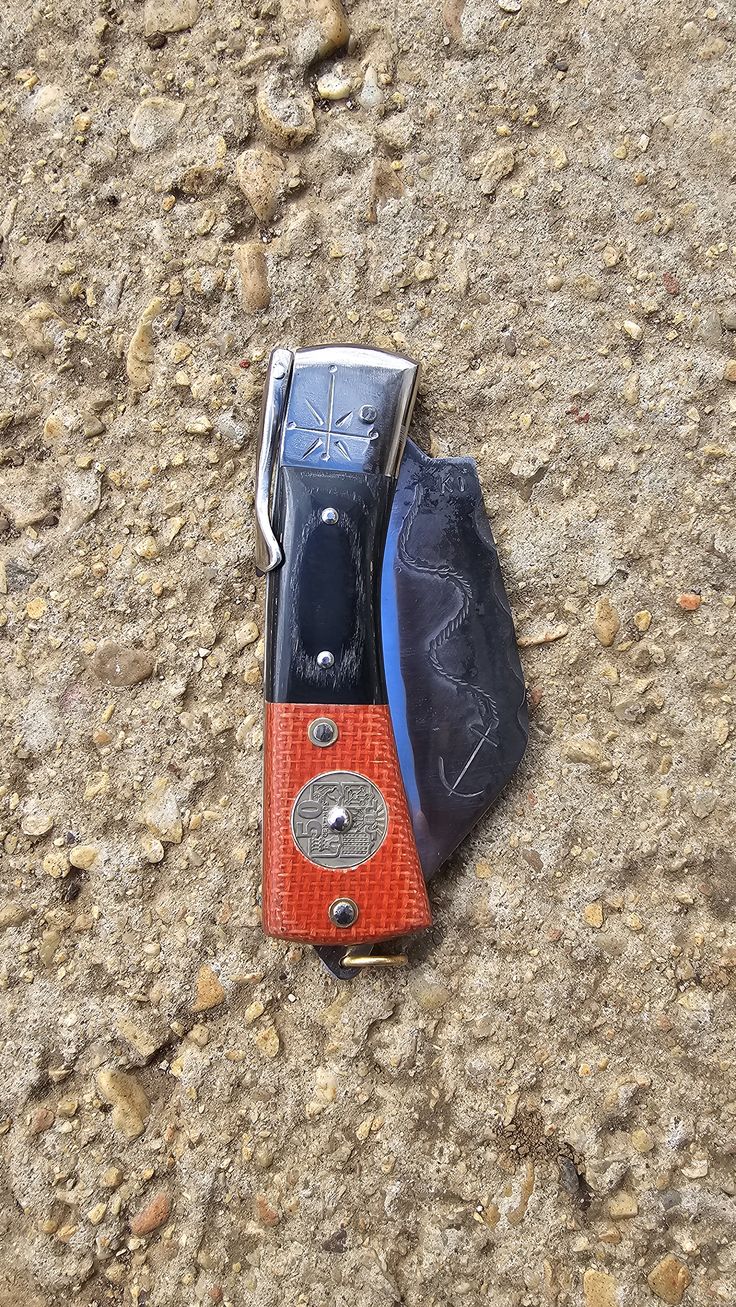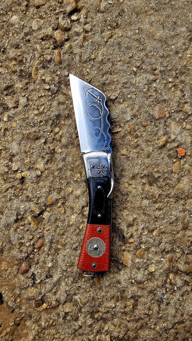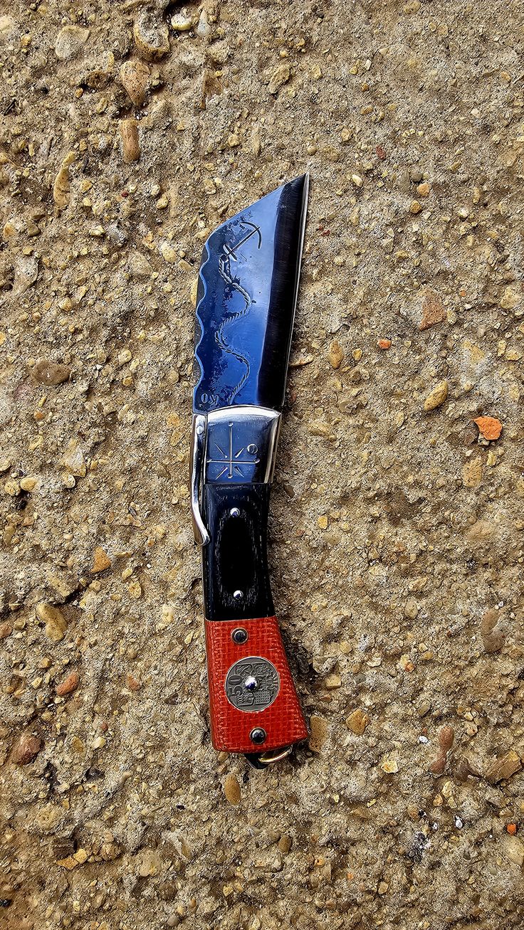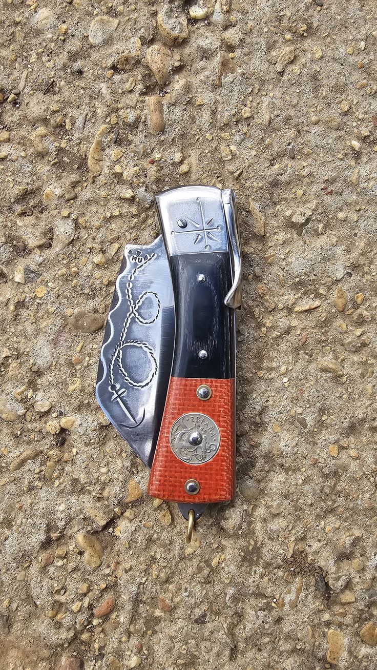 Hoja de Acero inoxidable mova, cachas en Mikarta hueso, forros, virola, palanquilla y remaches, en acero inoxidable 304.