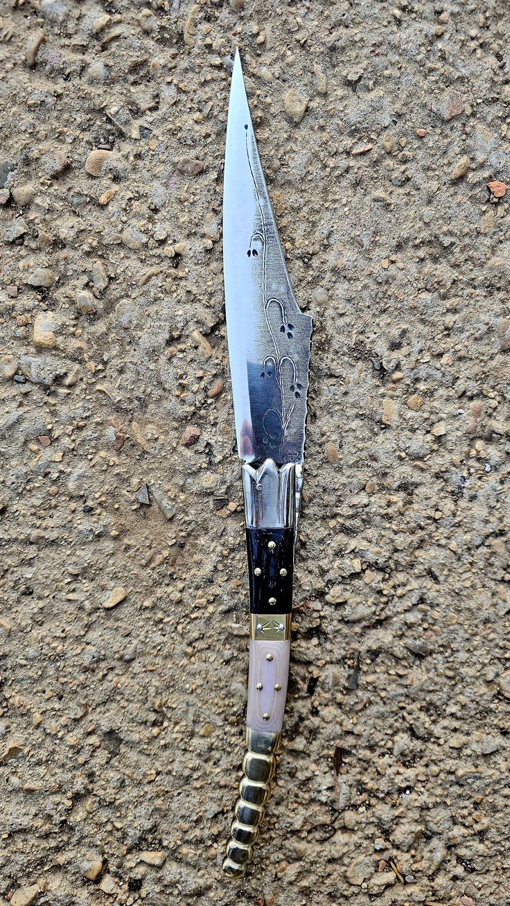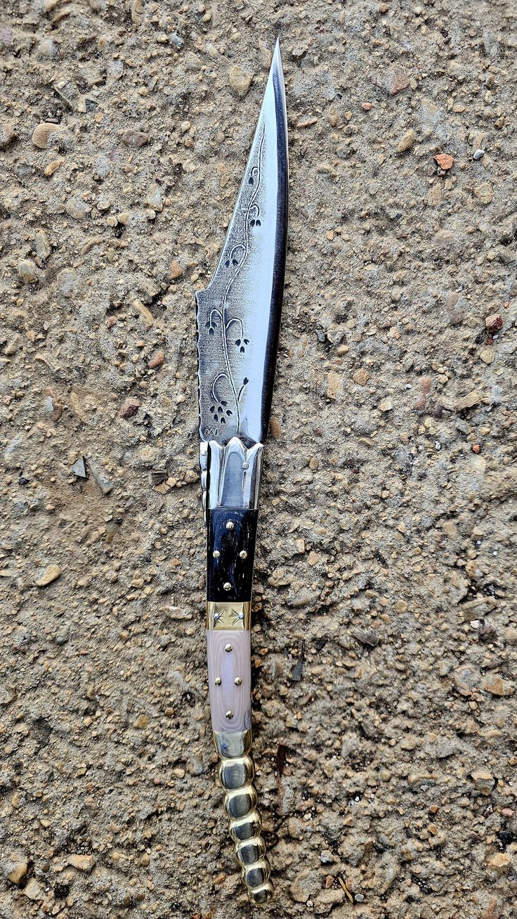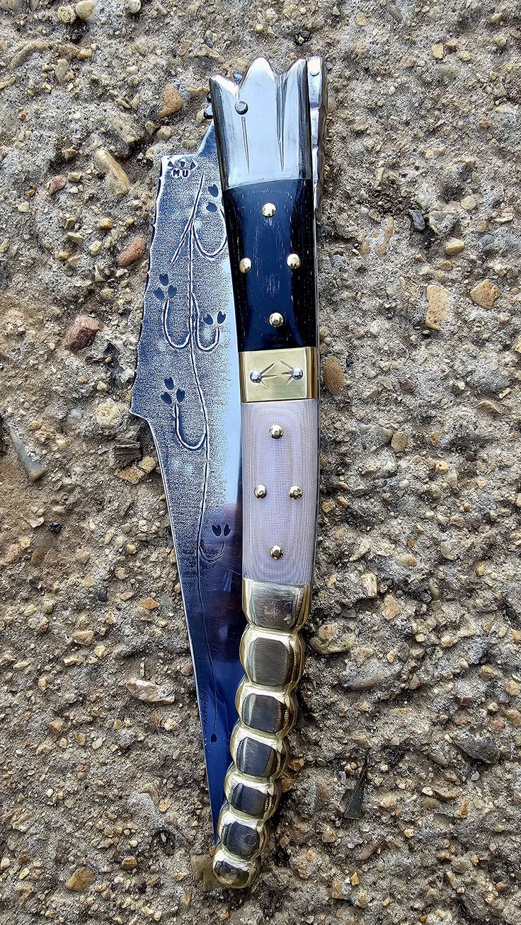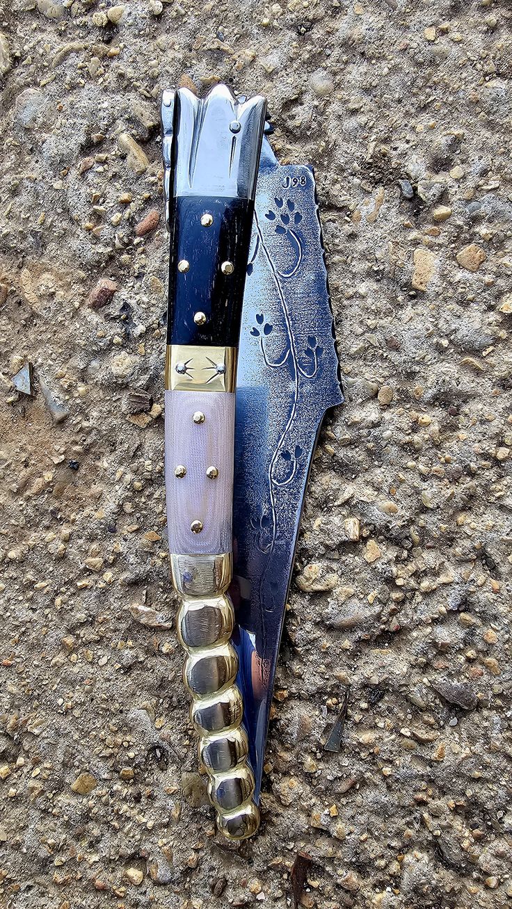 Hoja de Acero inoxidable mova, cachas en madera de Haya estabilizada, forros, virola, palanquilla, rebajo y remaches, en acero inoxidable 304 y Latón.