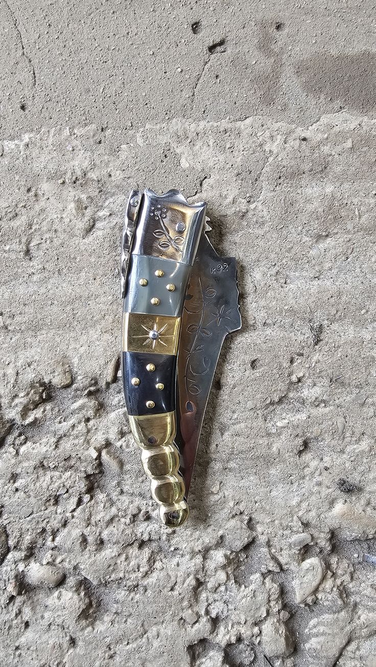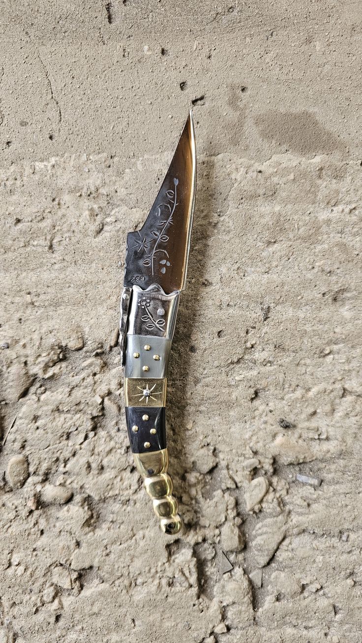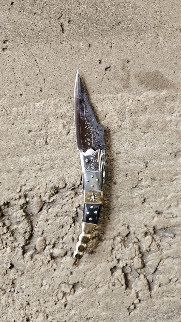 Hoja de Acero inoxidable mova, cachas en Cuerno, forros, virola, palanquilla, y remaches, en acero inoxidable 304.