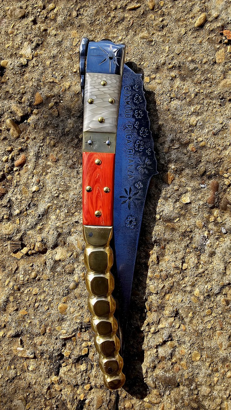 Hoja de Acero inoxidable mova, cachas en Mikarta y Juma, forros, virola, rebajo y remaches, en acero inoxidable 304 y Latón.