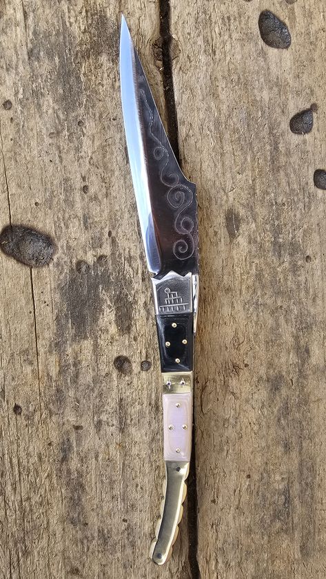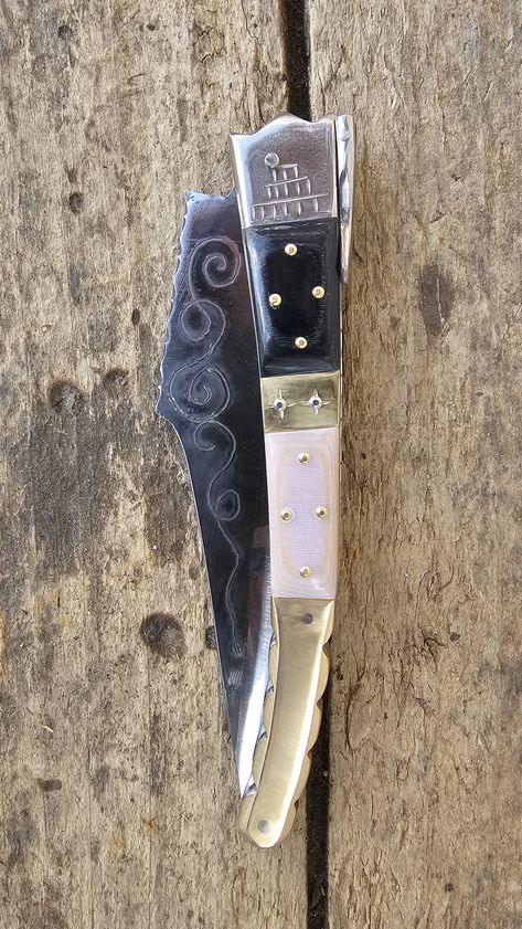 Hoja de Acero inoxidable mova, cachas Mikarta negra, hueso y Latón, forros, virola, y remaches, en acero inoxidable 304.