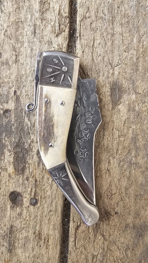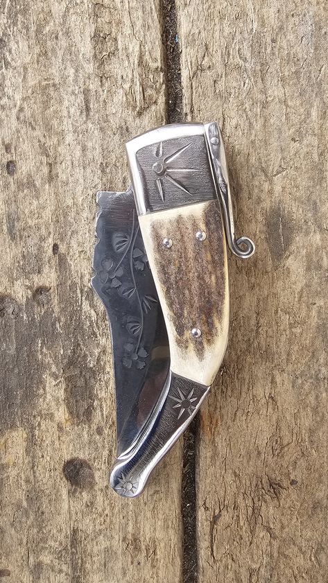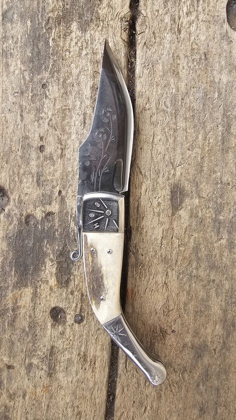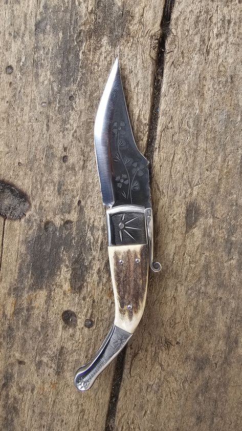 Hoja de Acero inoxidable mova, cachas en cuerno de Ciervo, forros, virola, palanquilla, rebajo y remaches, en acero inoxidable 304.