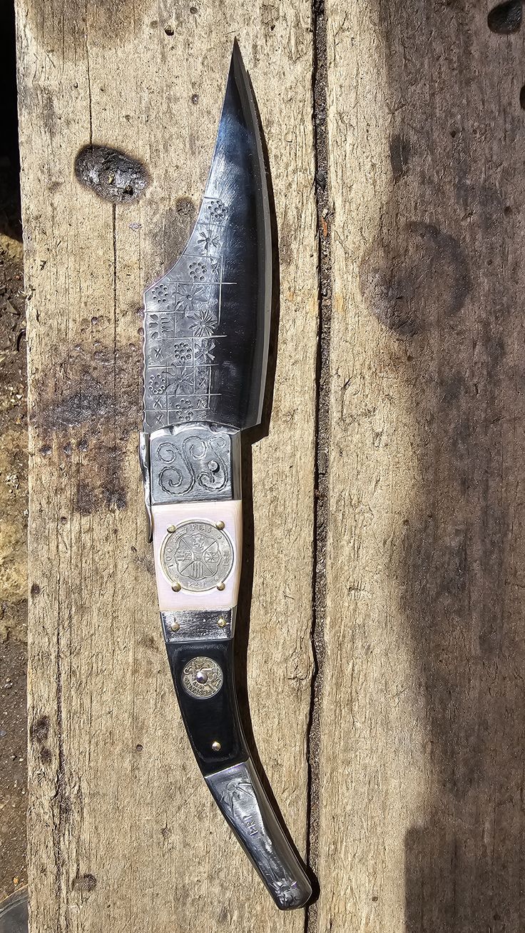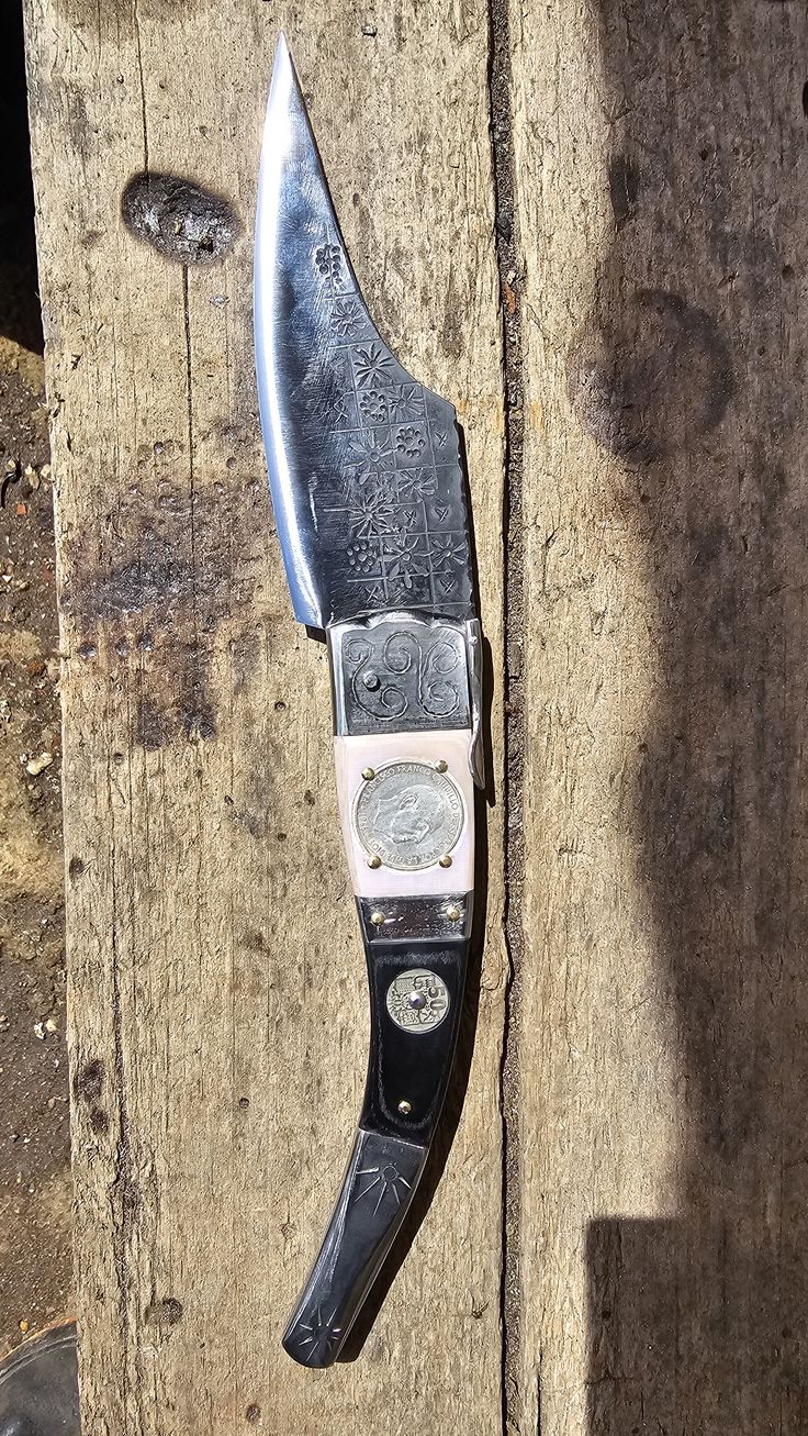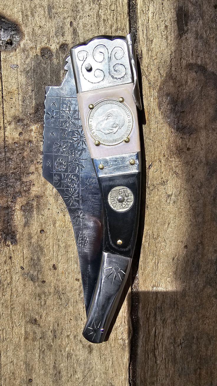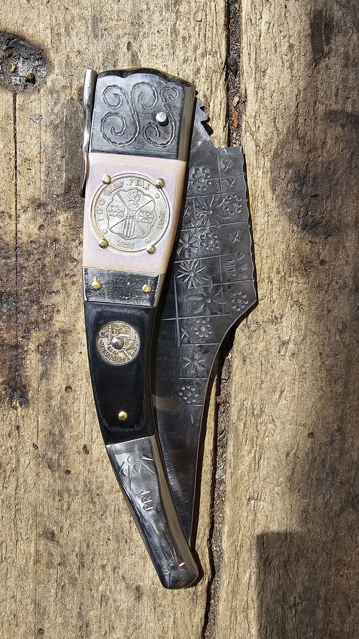 Hoja de Acero inoxidable mova, cachas de Mikarta y 2 monedas de 100 Pesetas de plata y 2 monedas de 25 centimos, forros, virola, palanquilla, rebajo y remaches, en acero inoxidable 304.