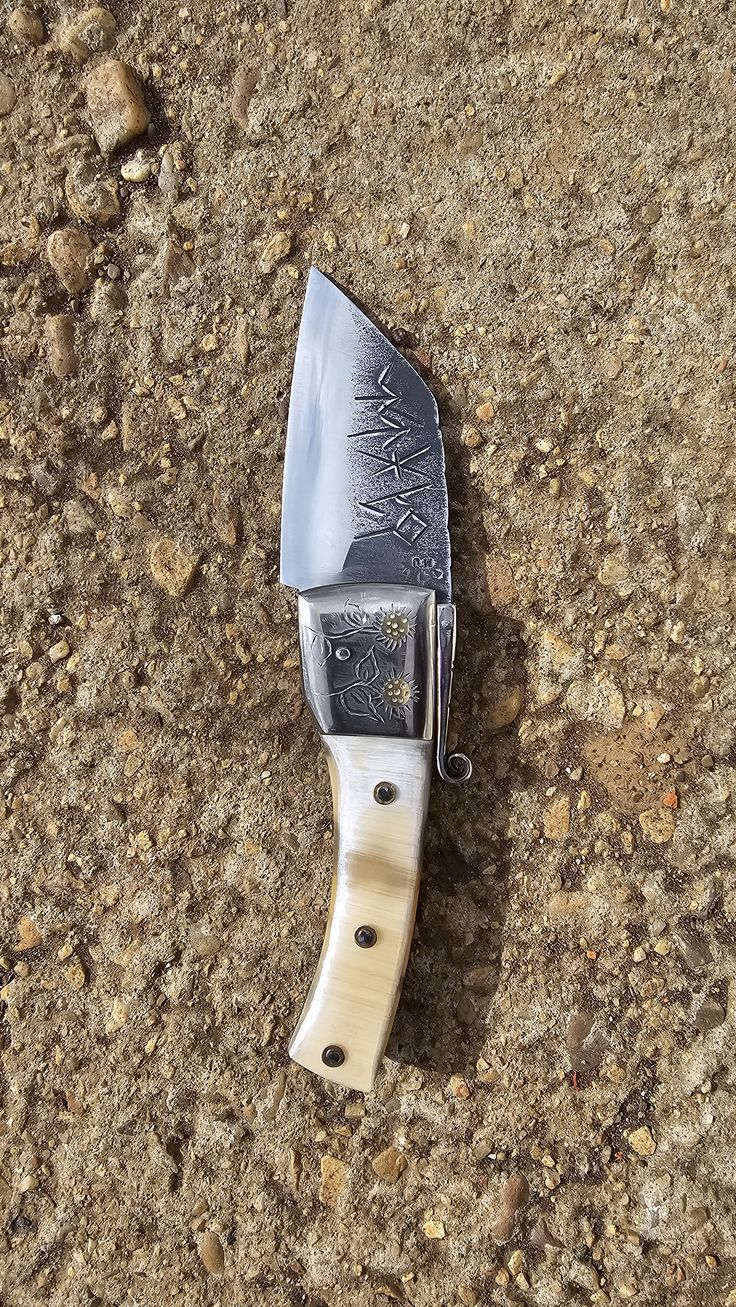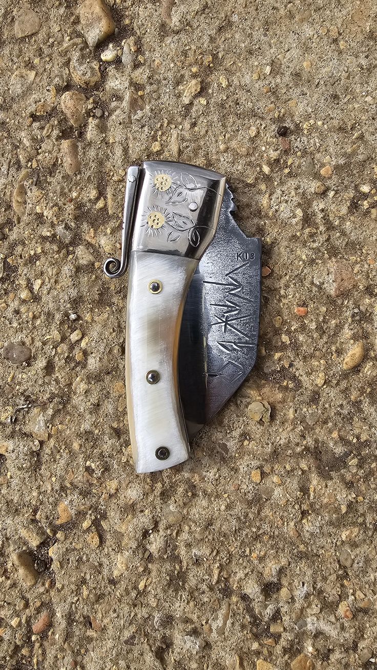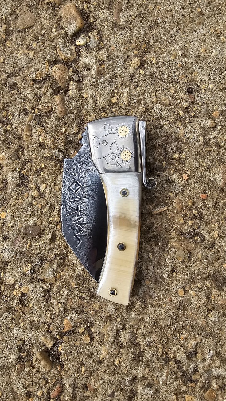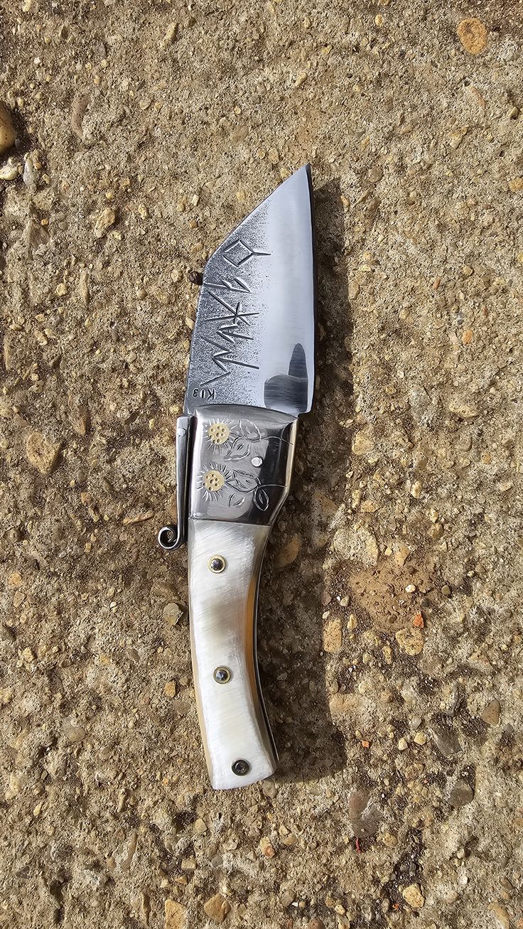Hola amigos esta navaja la he hecho yo, Antonio Mufer, la hago para mi, pero si la quieres, intentaré hacer otra parecida para ocupar su lugar, y nunca lo consigo, aunque la nueva pieza también tiene su encanto.
