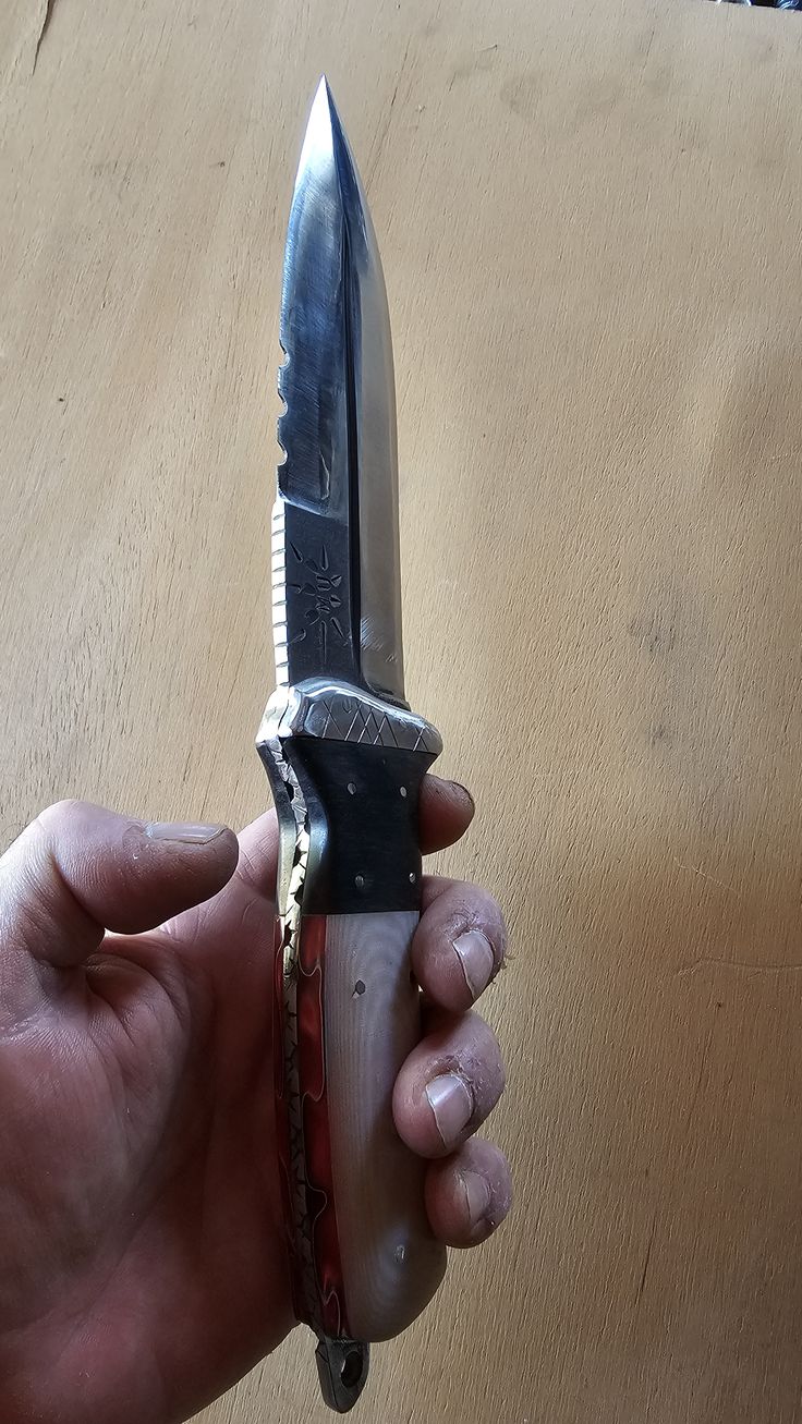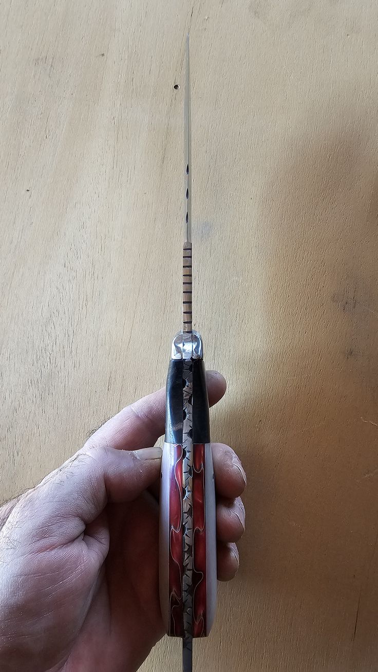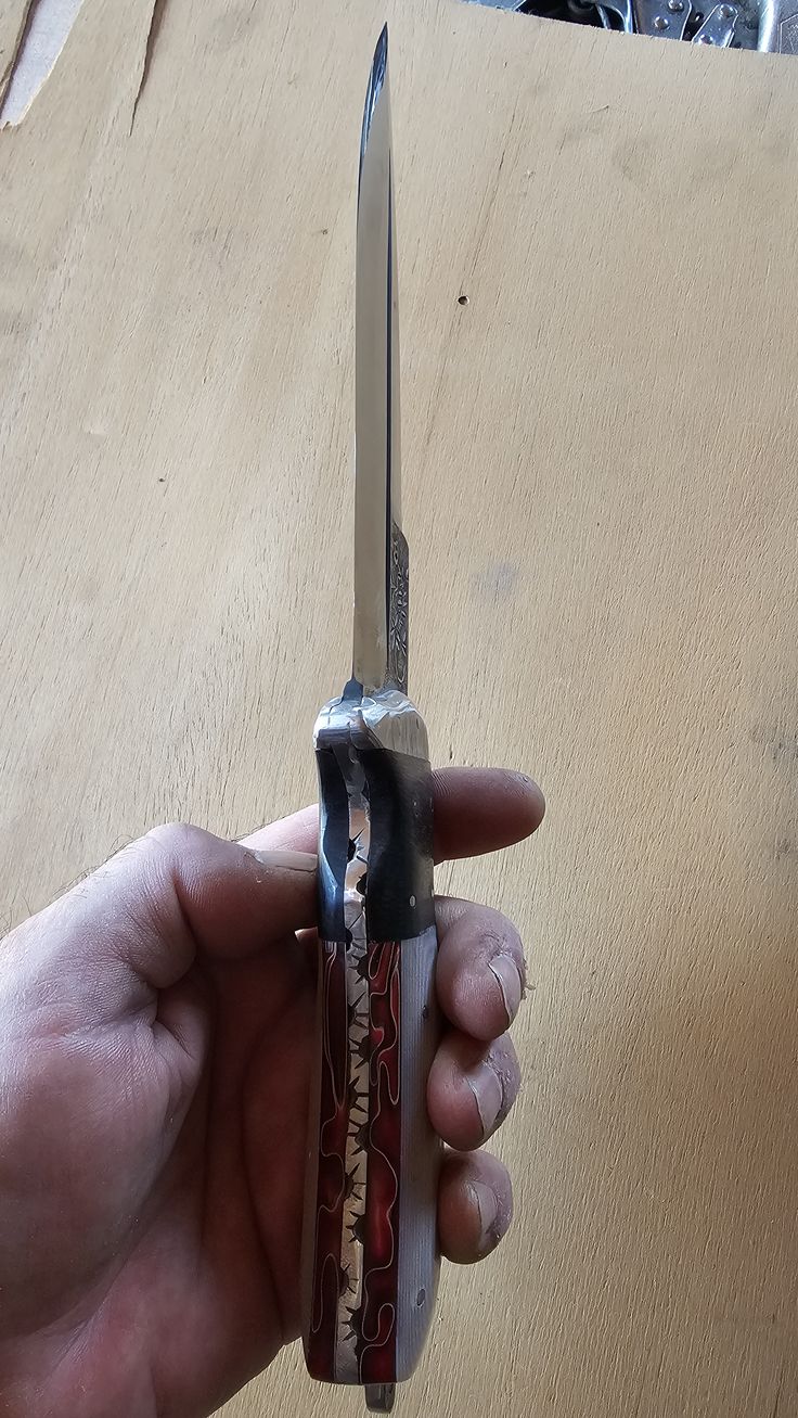 Hoja de Acero inoxidable mova, cachas en Mikarta, Ébano y acrílico, remaches, en acero inoxidable 304.