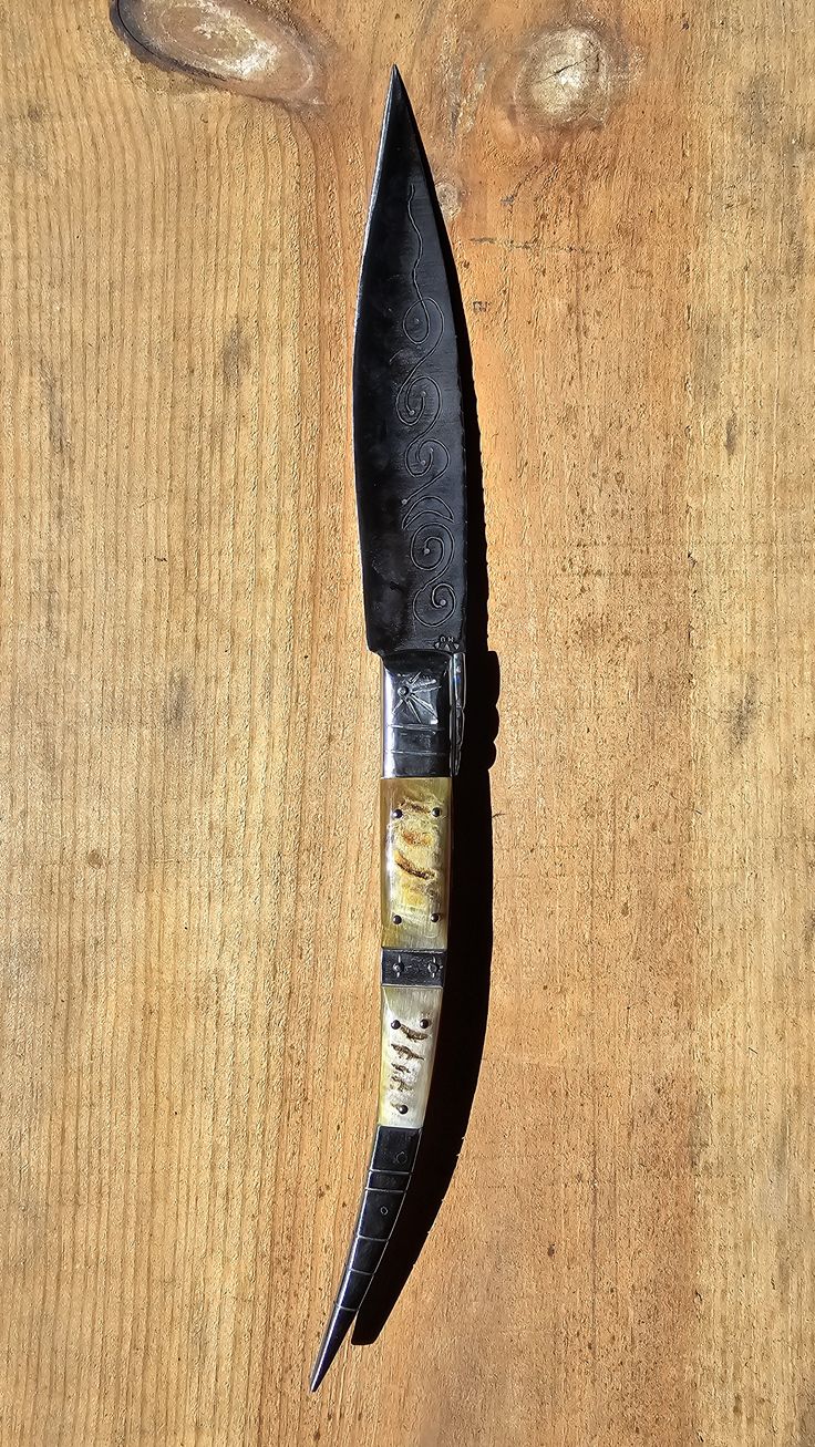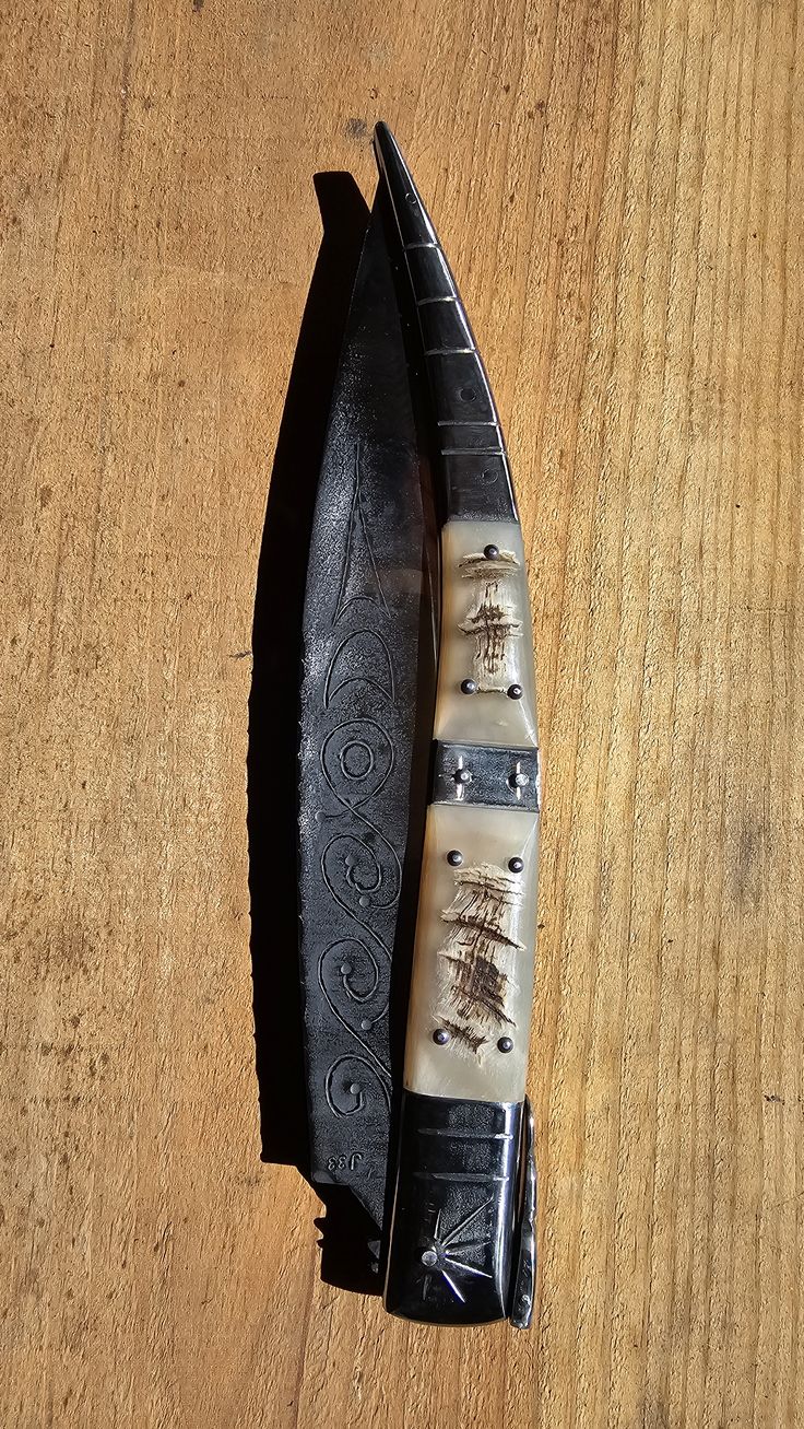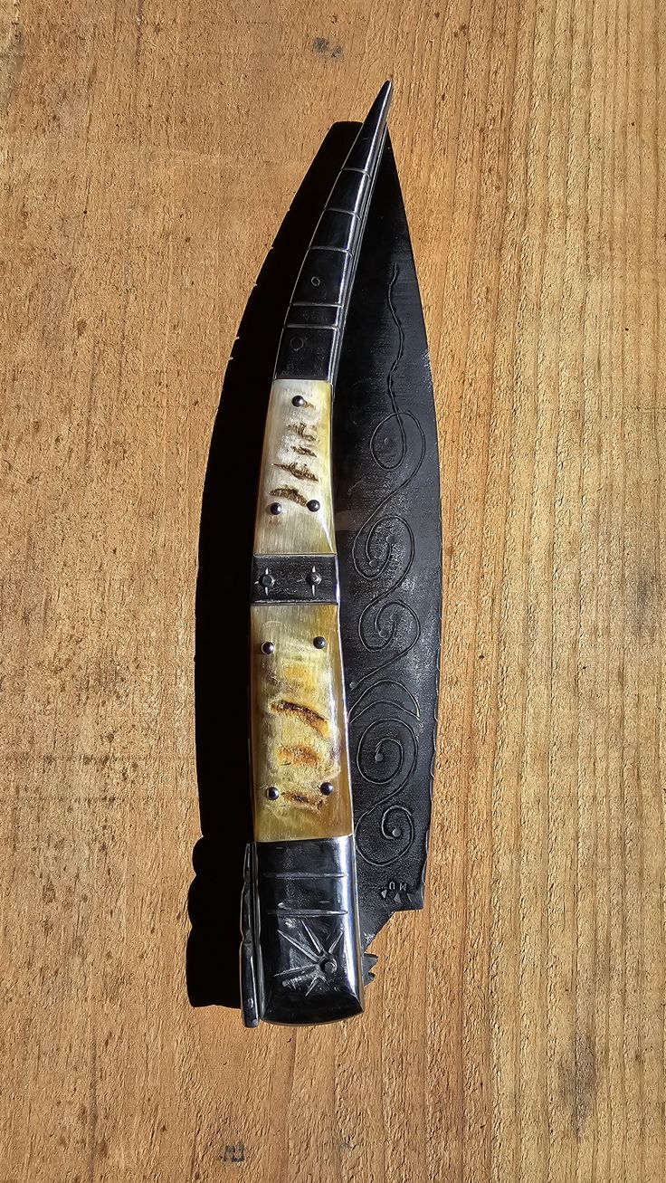 Hoja de Acero inoxidable mova, cachas en cuerno de Carnero, forros, virola, palanquilla, rebajo y remaches, en acero inoxidable 304.