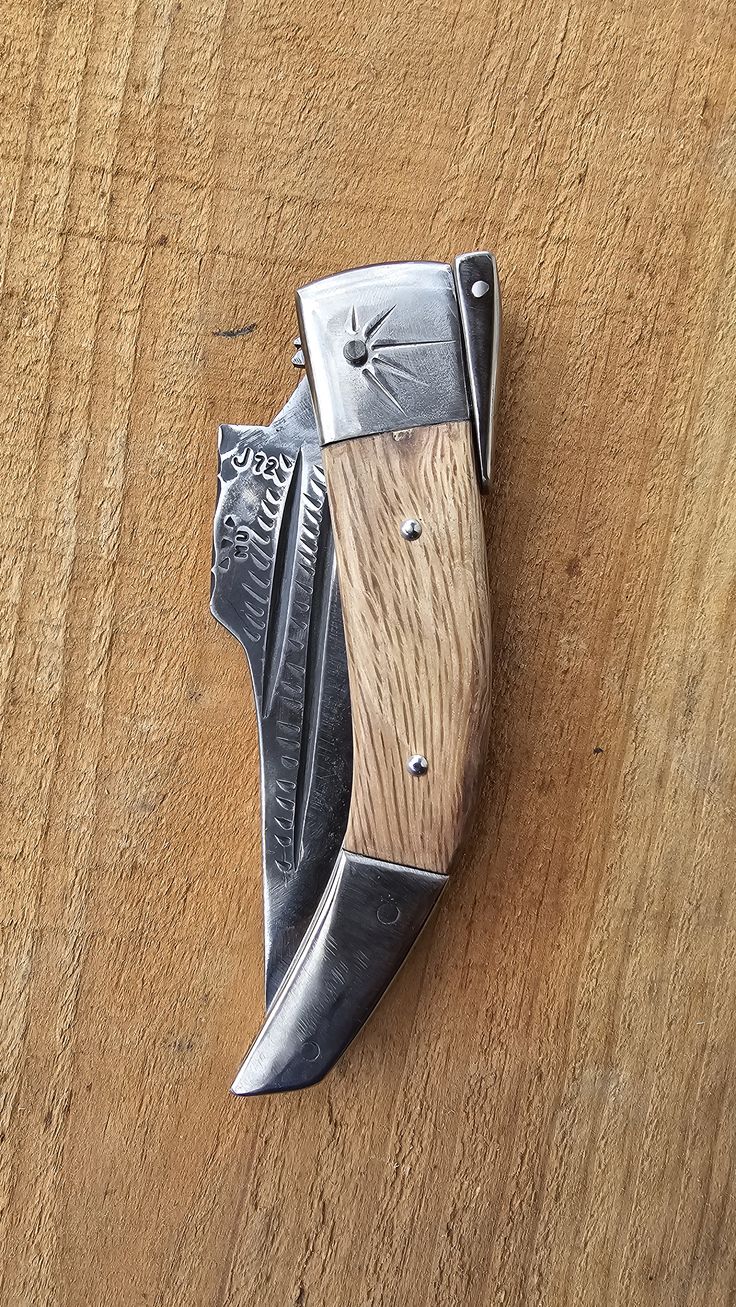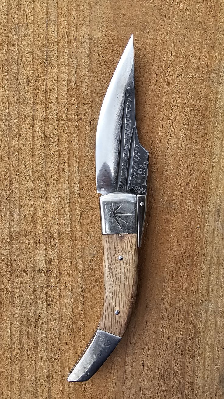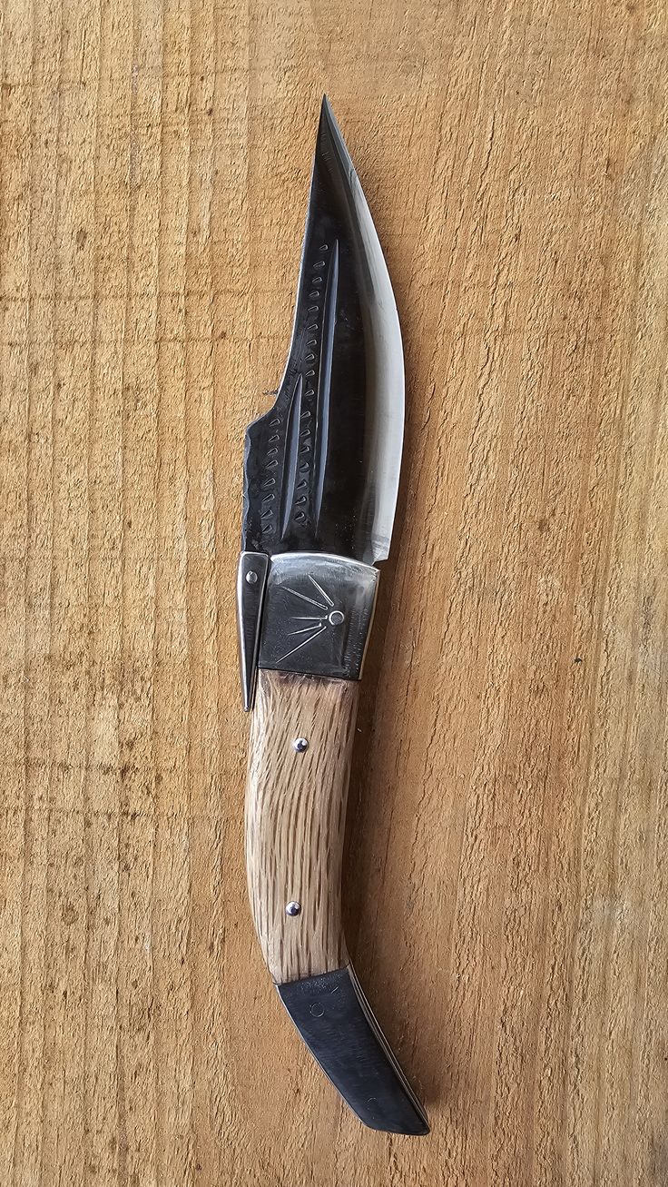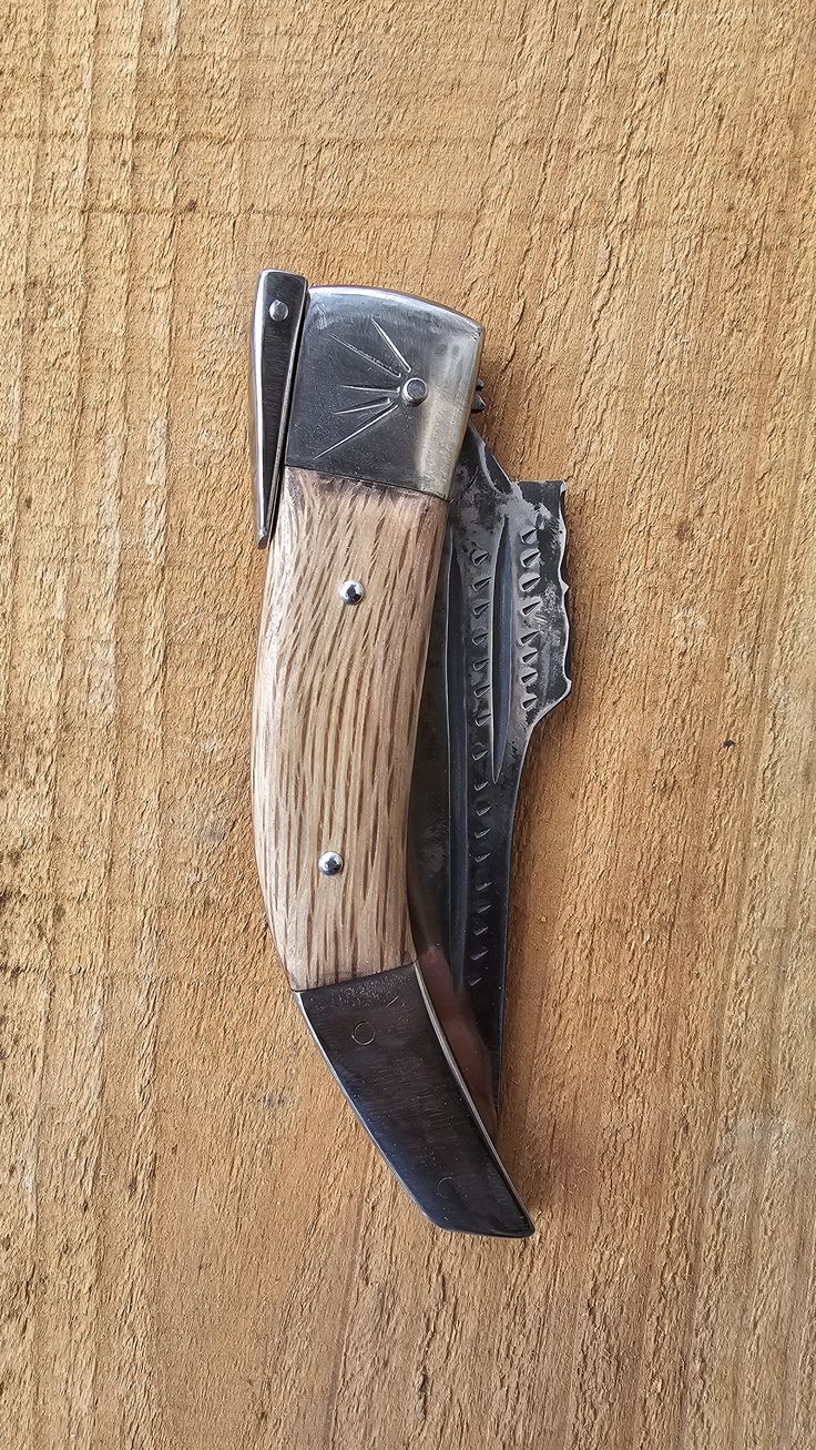 Hoja de Acero inoxidable mova, cachas en cuerno de Ciervo, forros, virola, y remaches, en acero inoxidable 304.