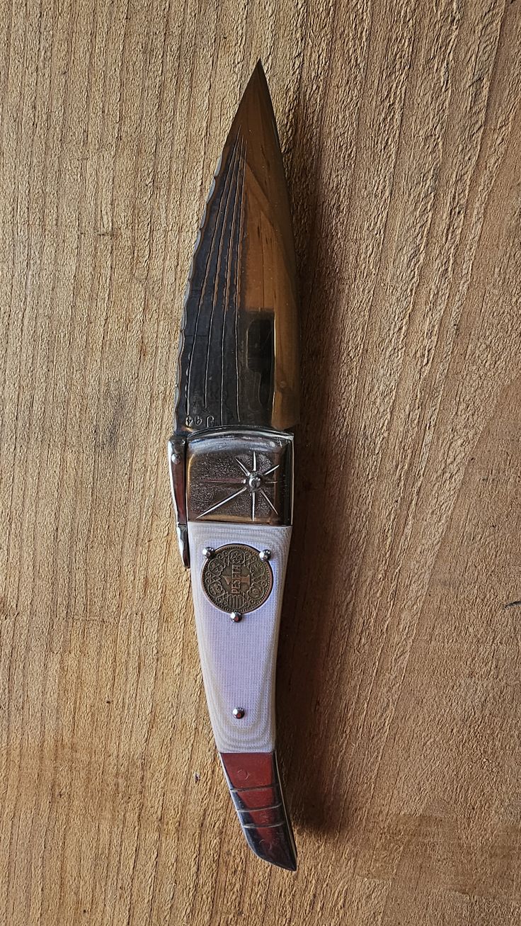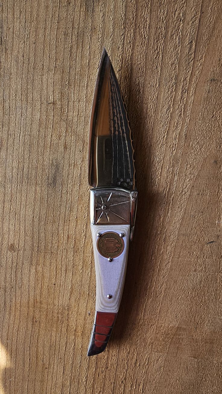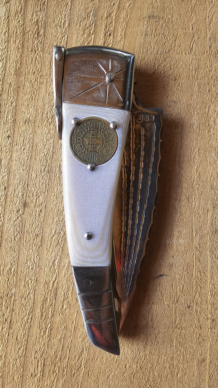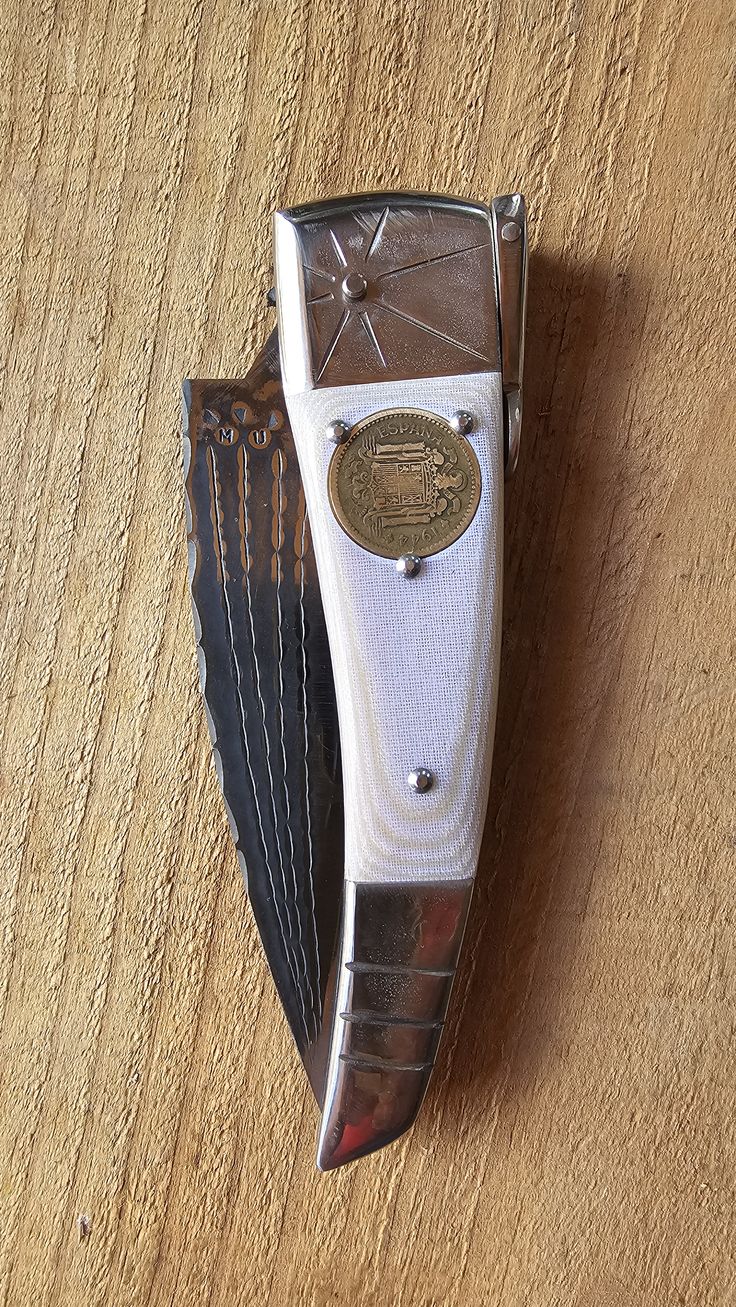 Hoja de Acero inoxidable mova, cachas Mikarta hueso y dos Pesetas, forros, virola, palanquilla, y remaches, en acero inoxidable 304.
