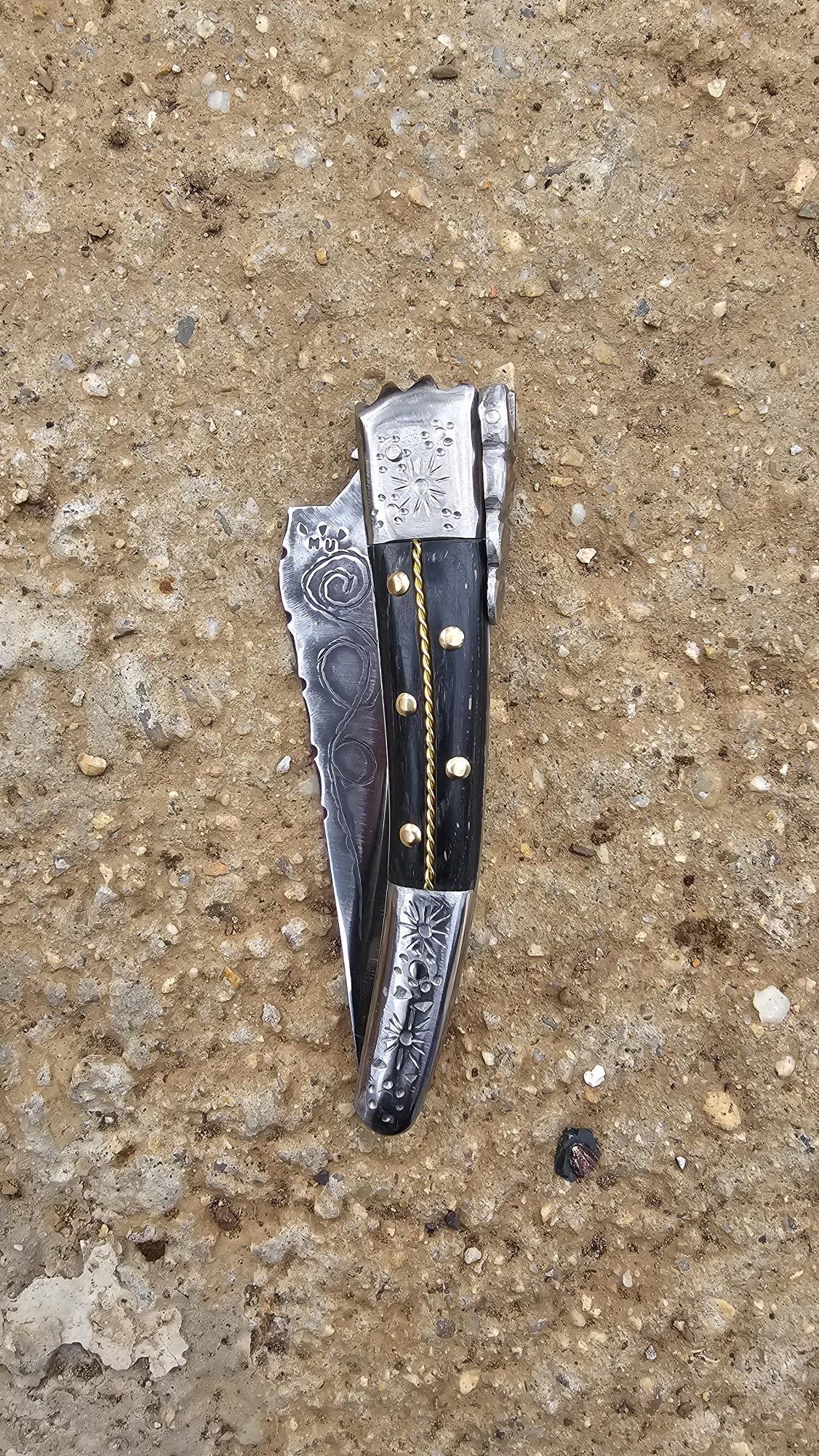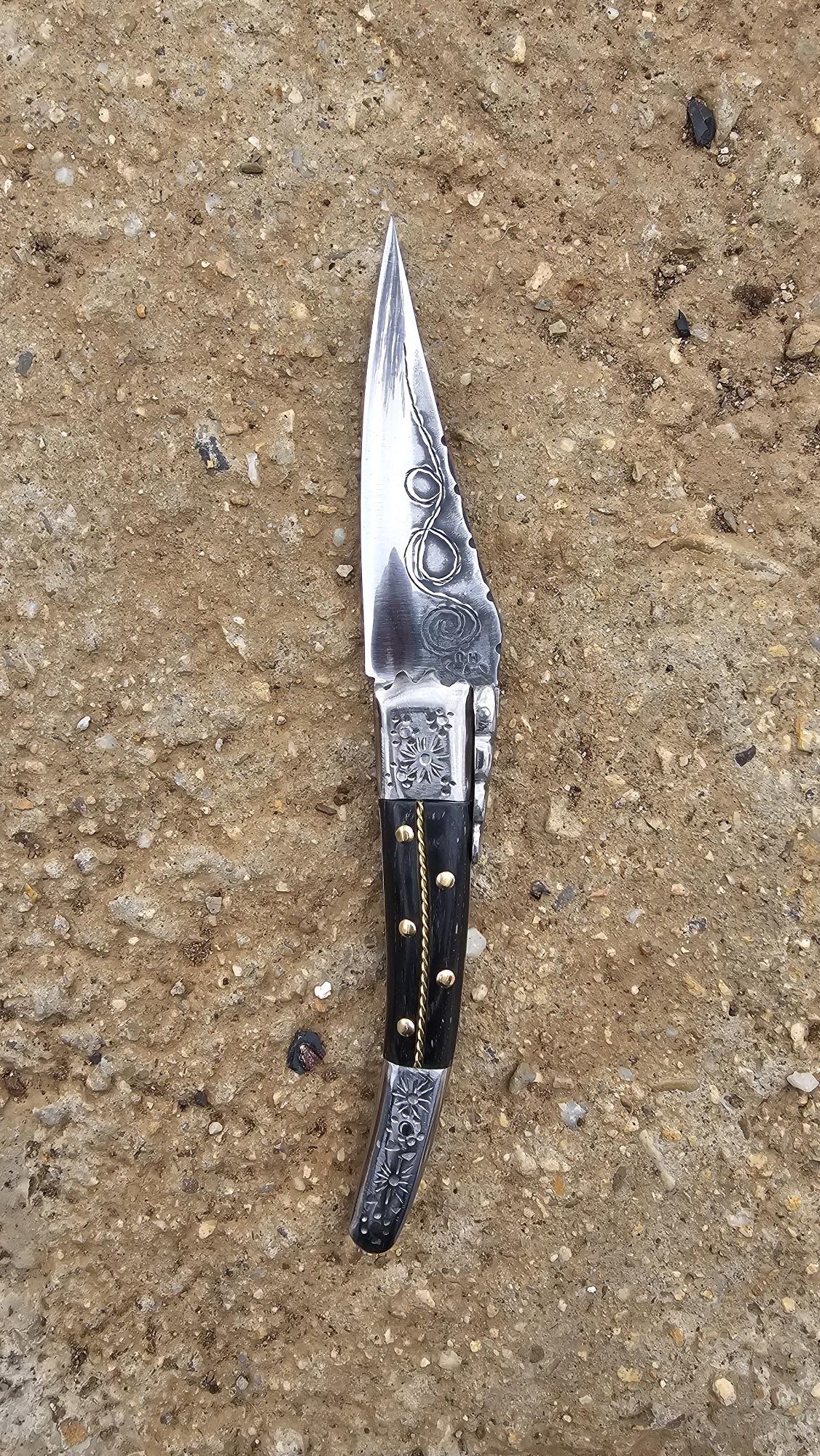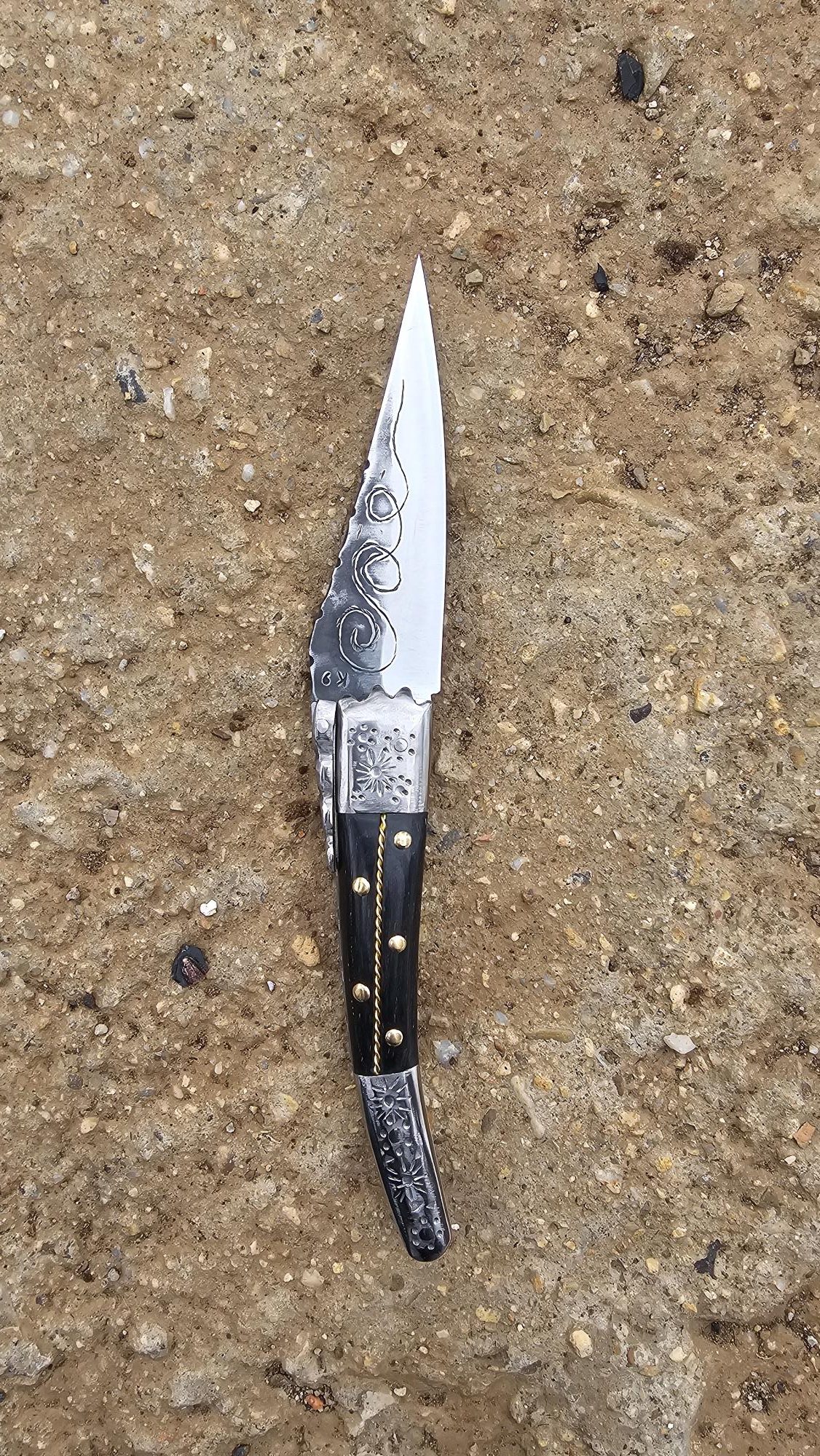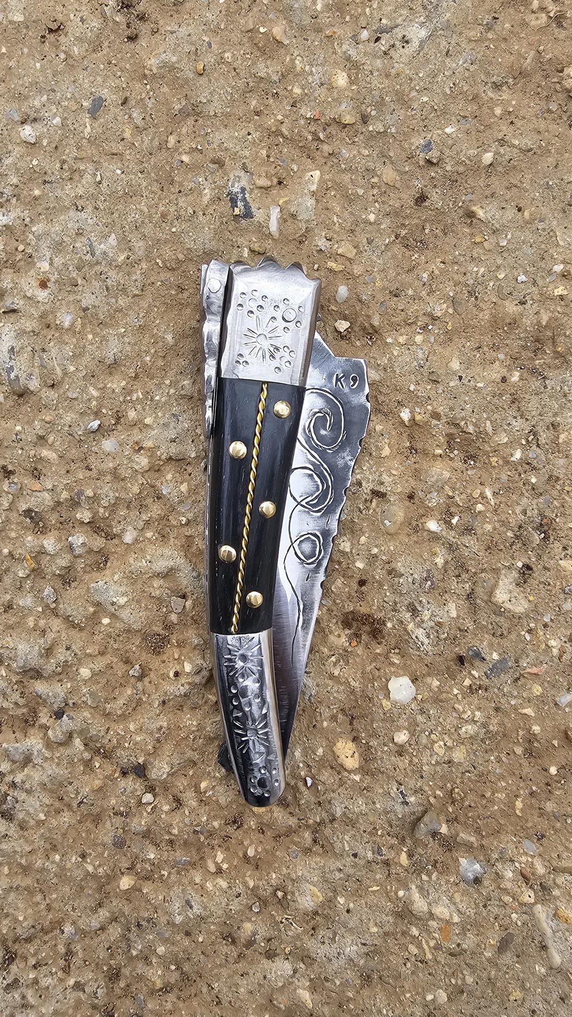 Cada pieza ha sido diseñada, cortada, amolada, tallada, ajustada y pulida de forma individual y con especial cariño. Los materiales de esta pieza son.