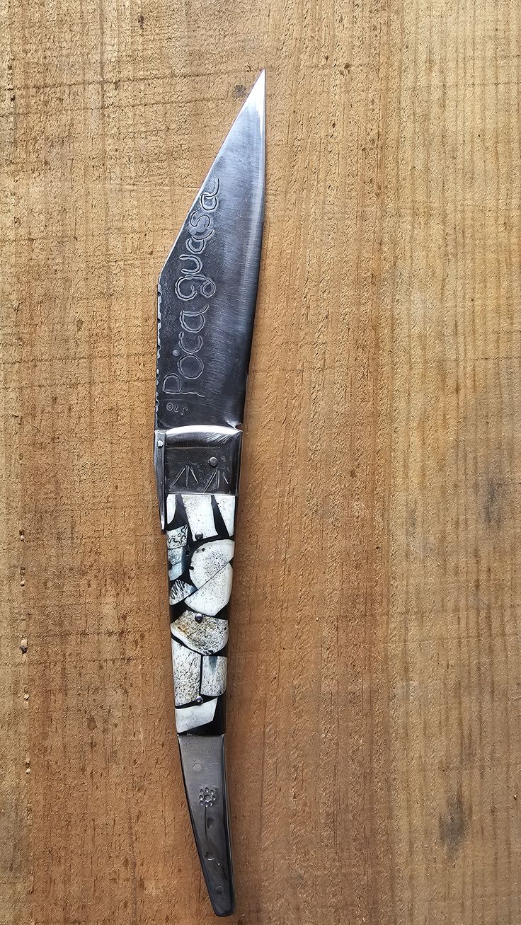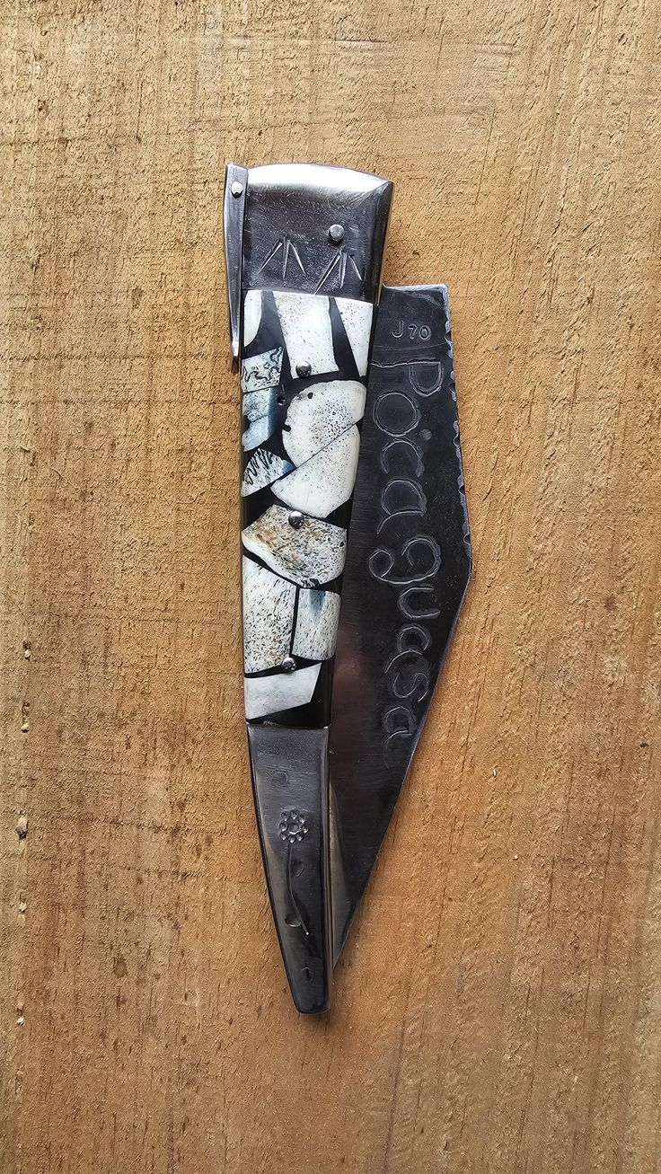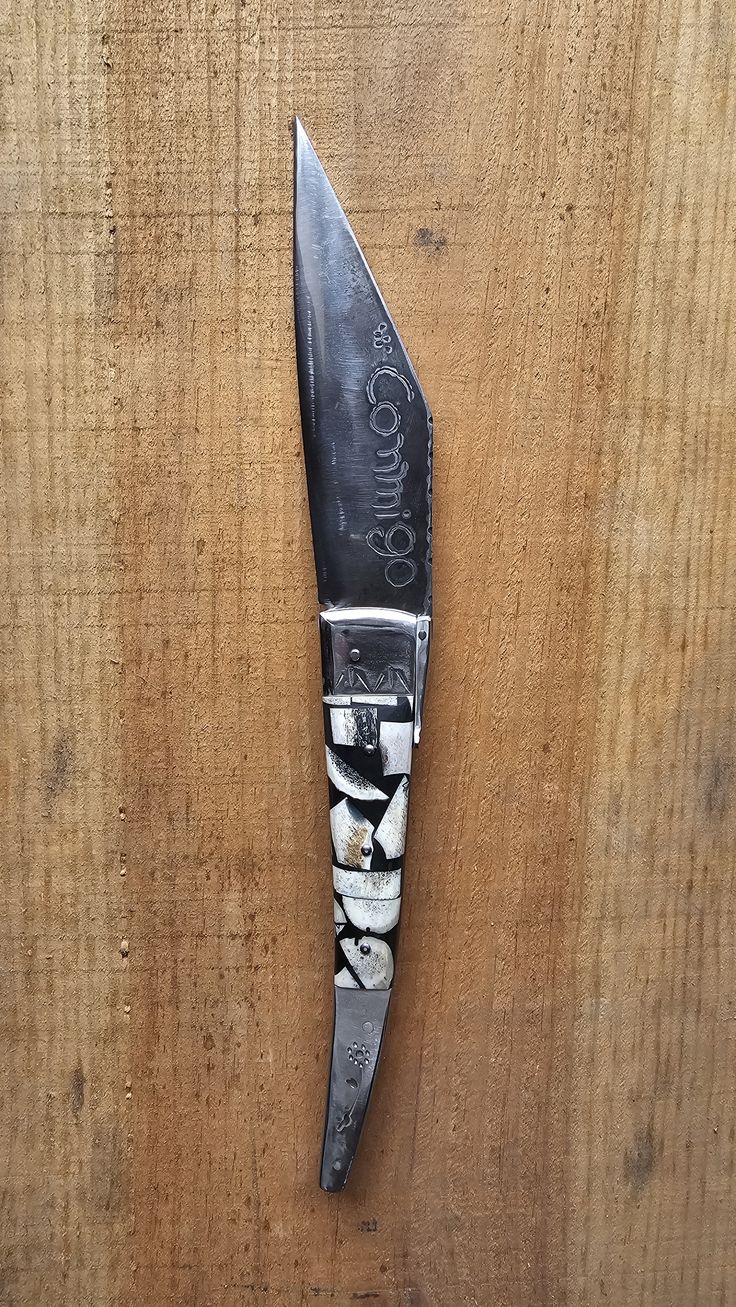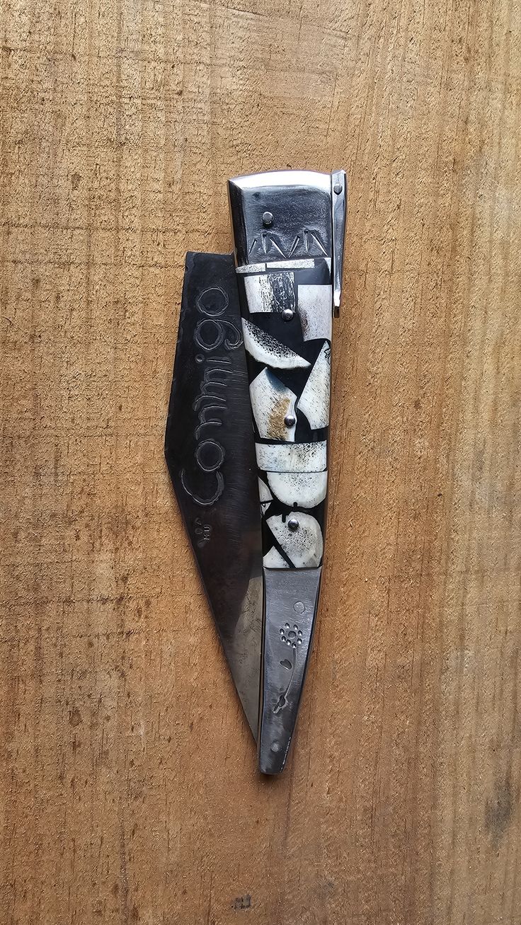 Hoja de Acero inoxidable mova, cachas en cuerno de Ciervo, forros, virola, y remaches, en acero inoxidable 304.